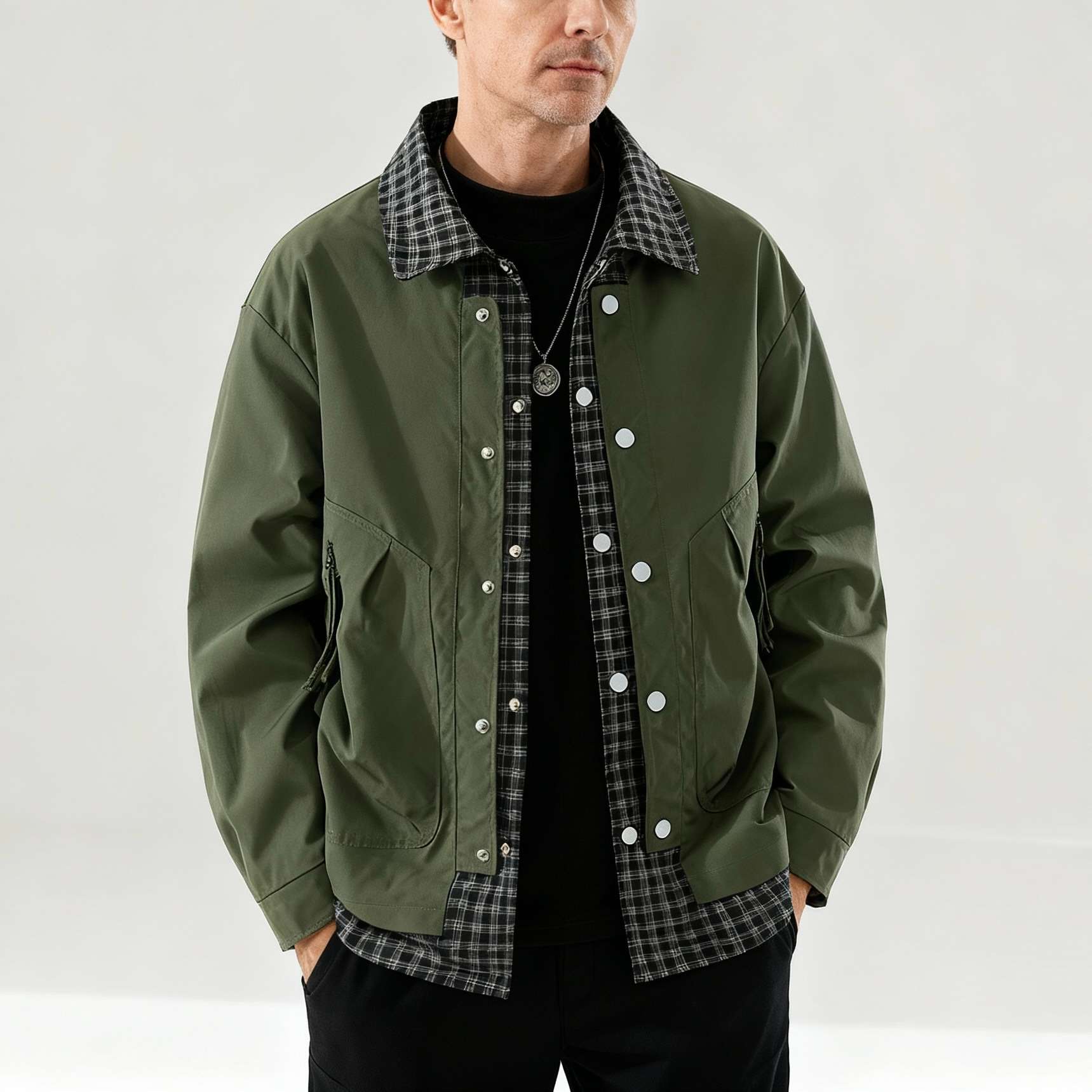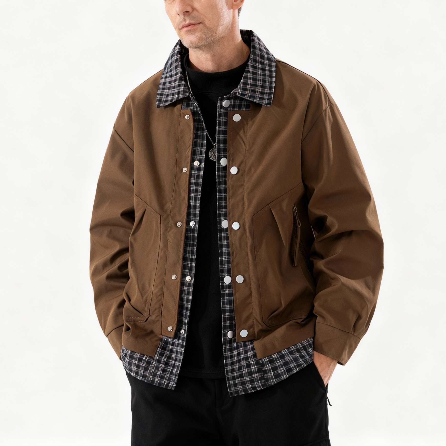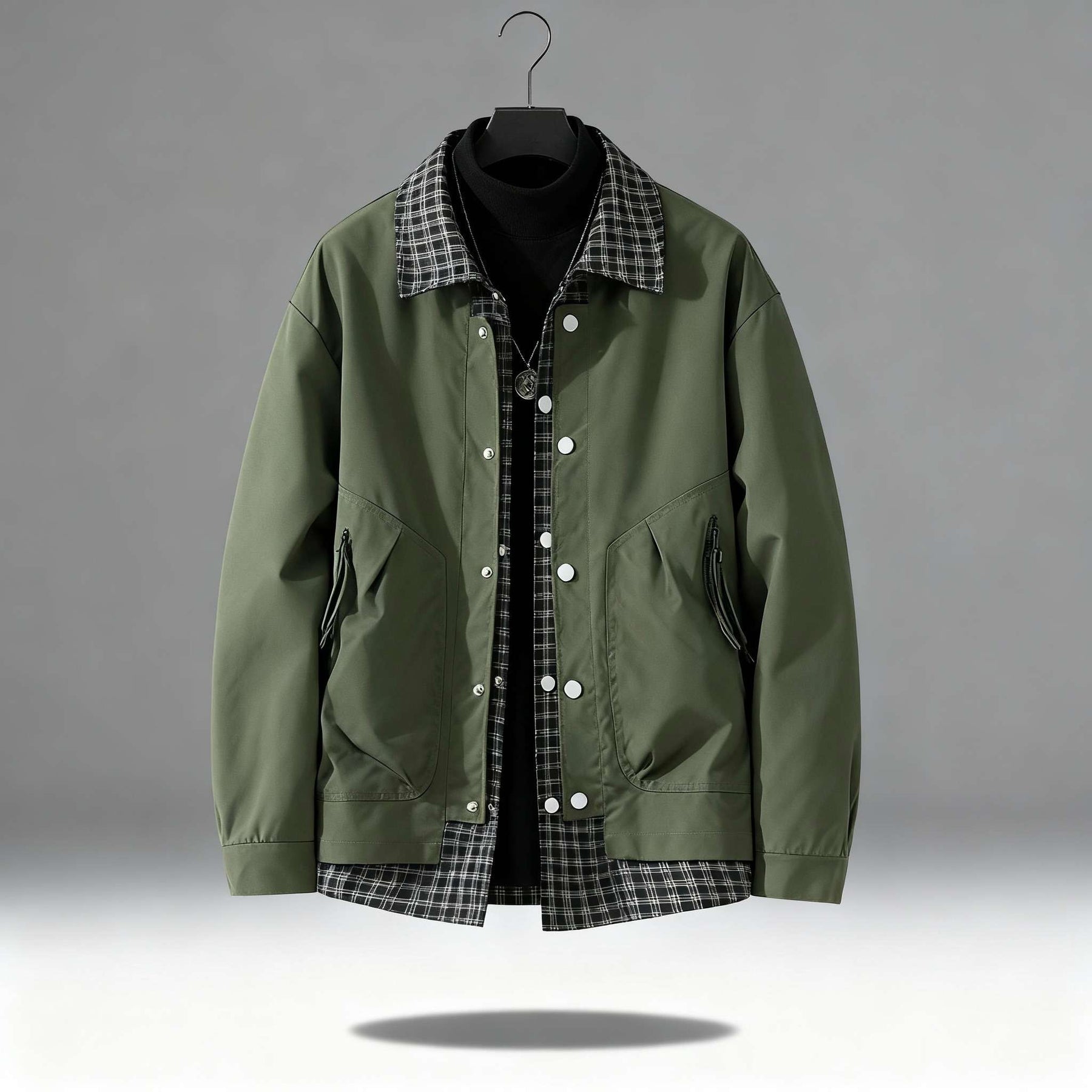 A designer jacket characterized by its layered detailing and soft-touch lining. The snap button front frames a checked collar and inner placket, adding depth to its one-piece design. A smooth, matte finish with angled seams define the look.