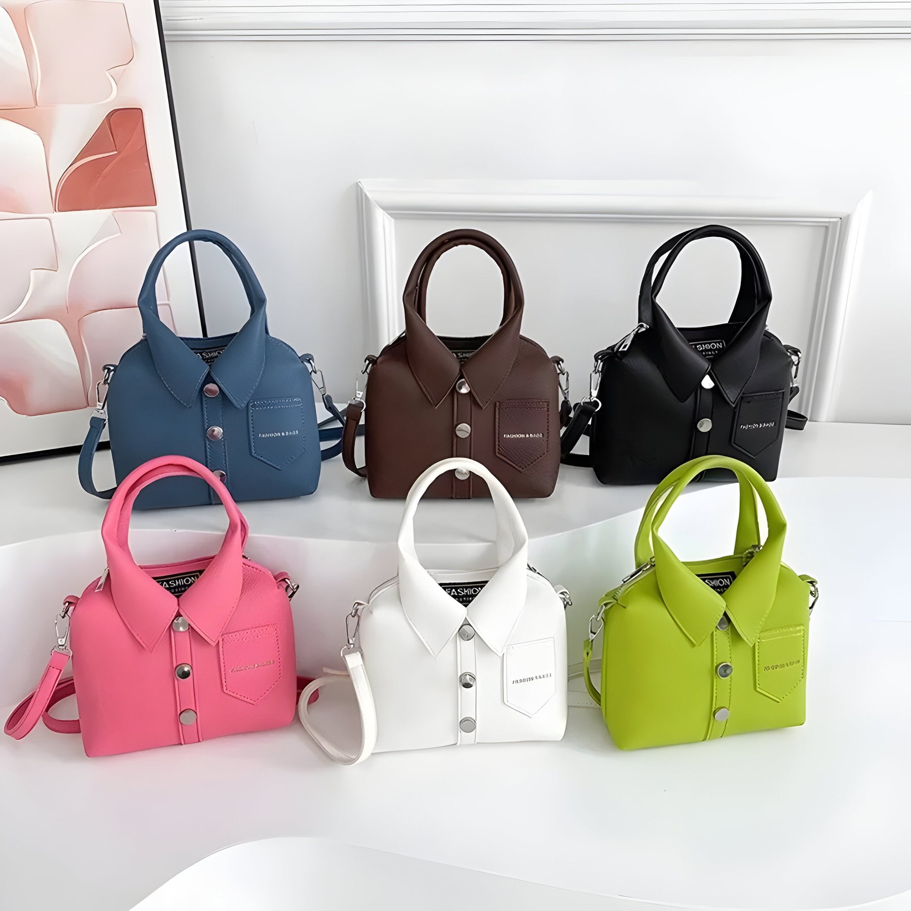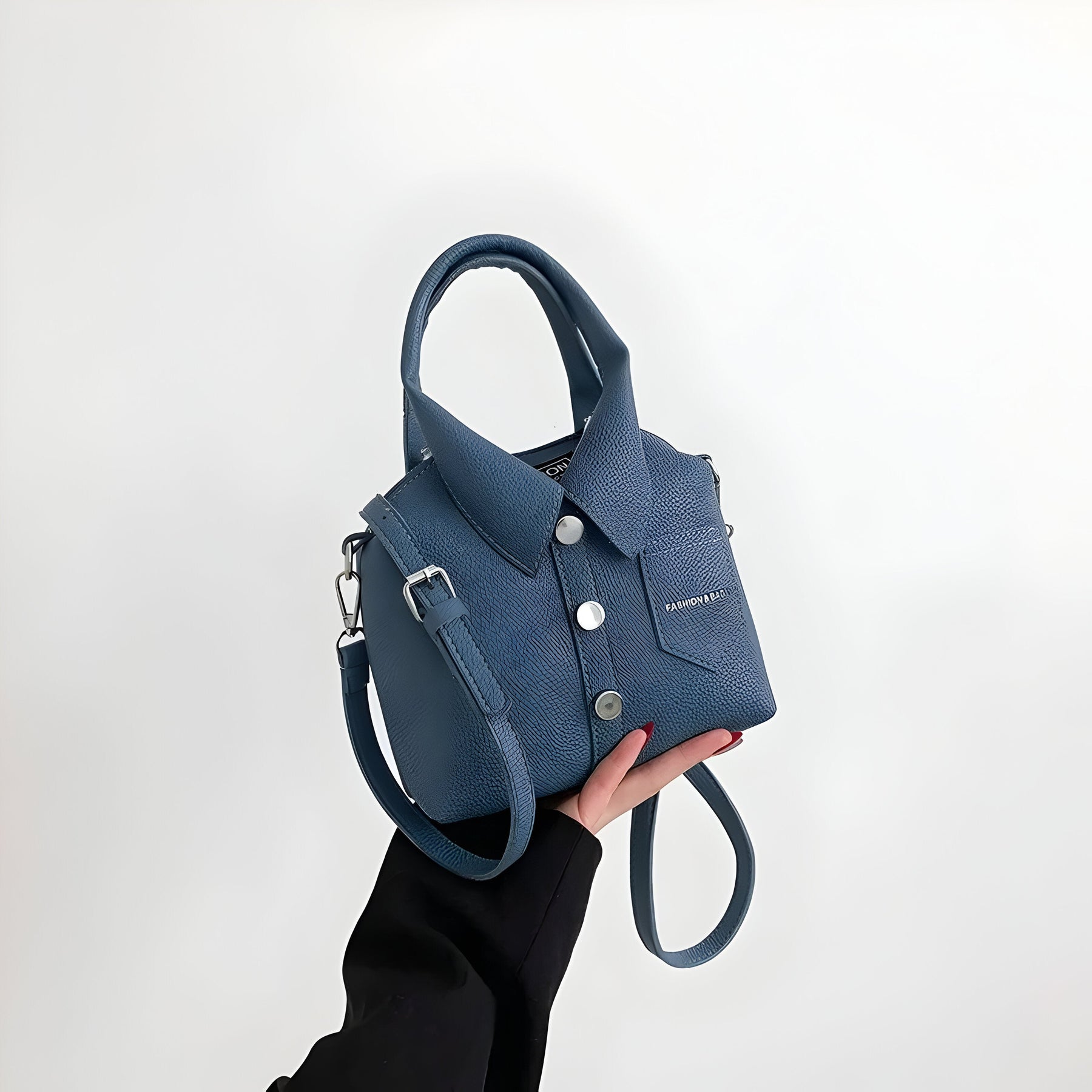 The Collar Carry stands out with a one-of-a-kind design and a playful sense of style. Made from durable vegan leather with room for daily essentials, it includes top handles and an adjustable shoulder strap for flexible use. An eye-catching piece that gets noticed and often earns a second glance.