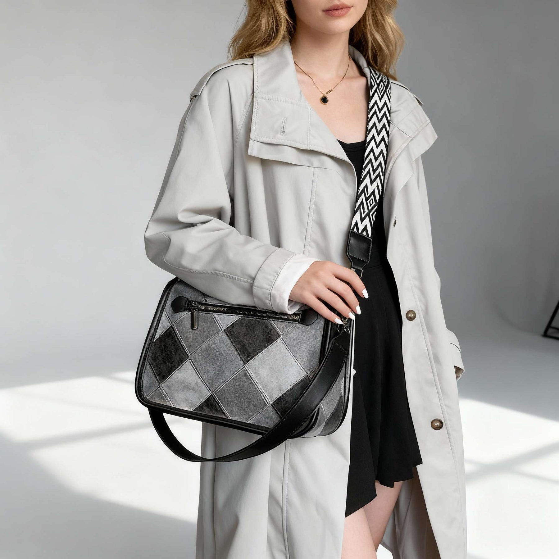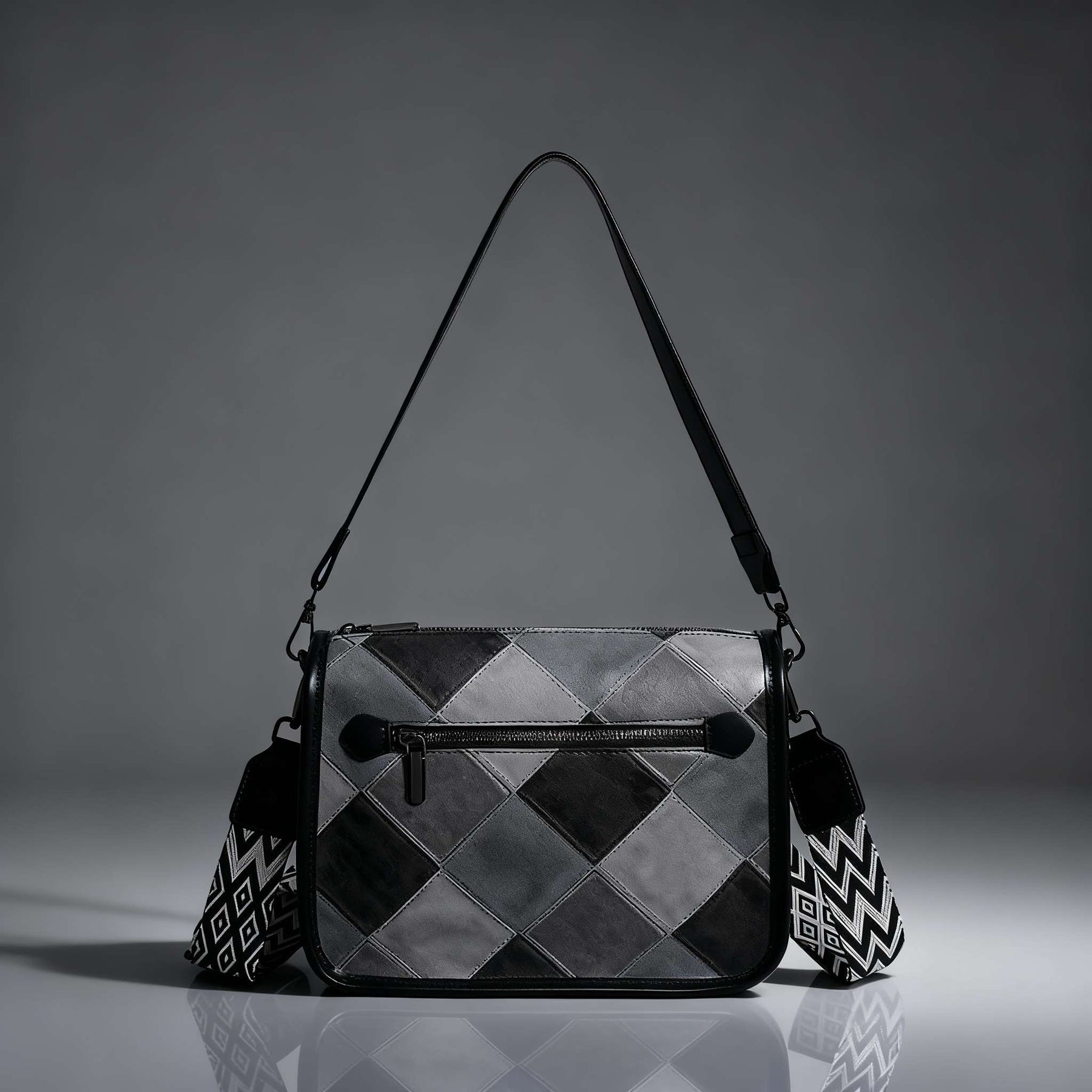 Crafted from premium vegan leather with a patterned finish by Madena New York Designs. The structured design provides space for daily essentials and the top zip-up setup keeps items close at hand. Adjustable straps for a tailored fit