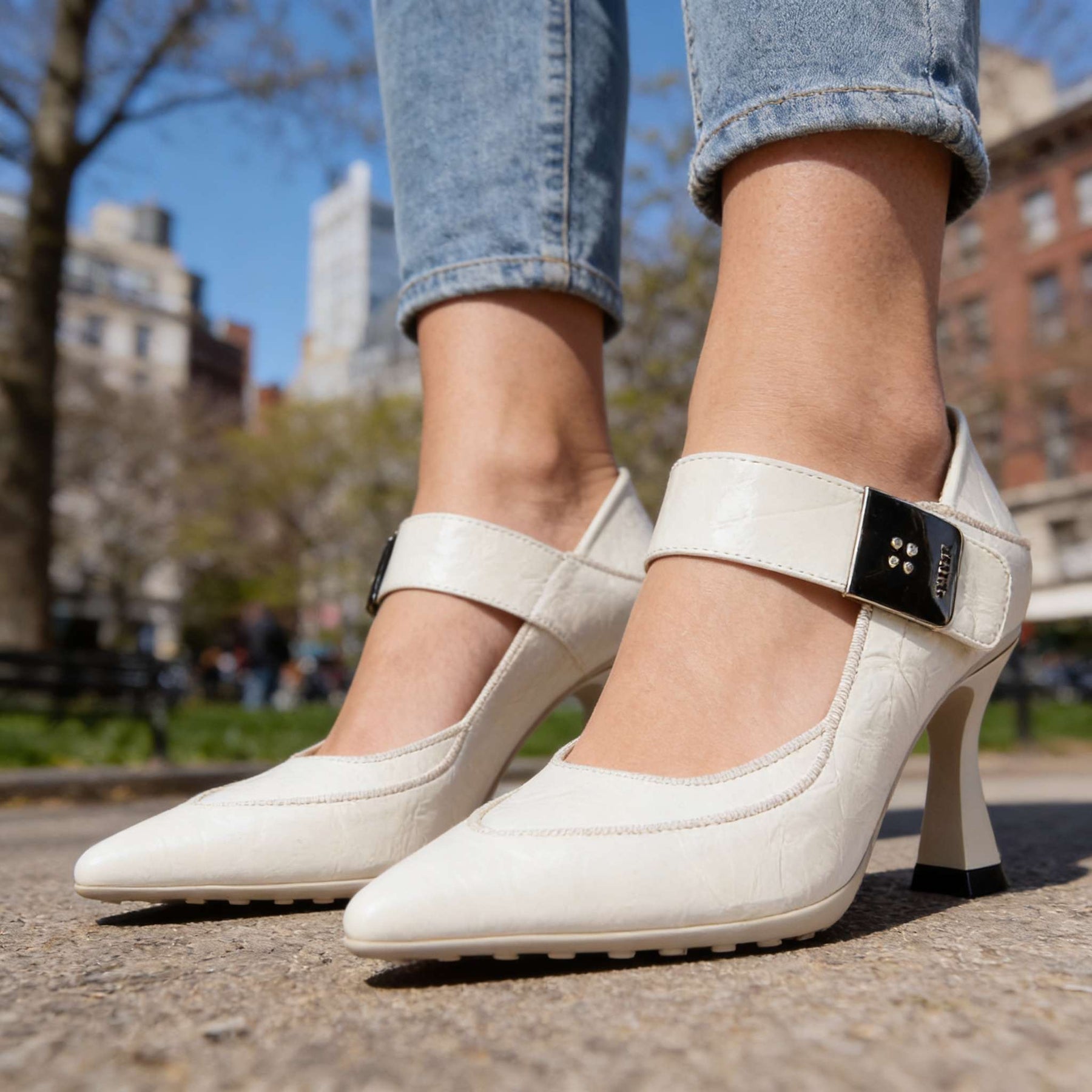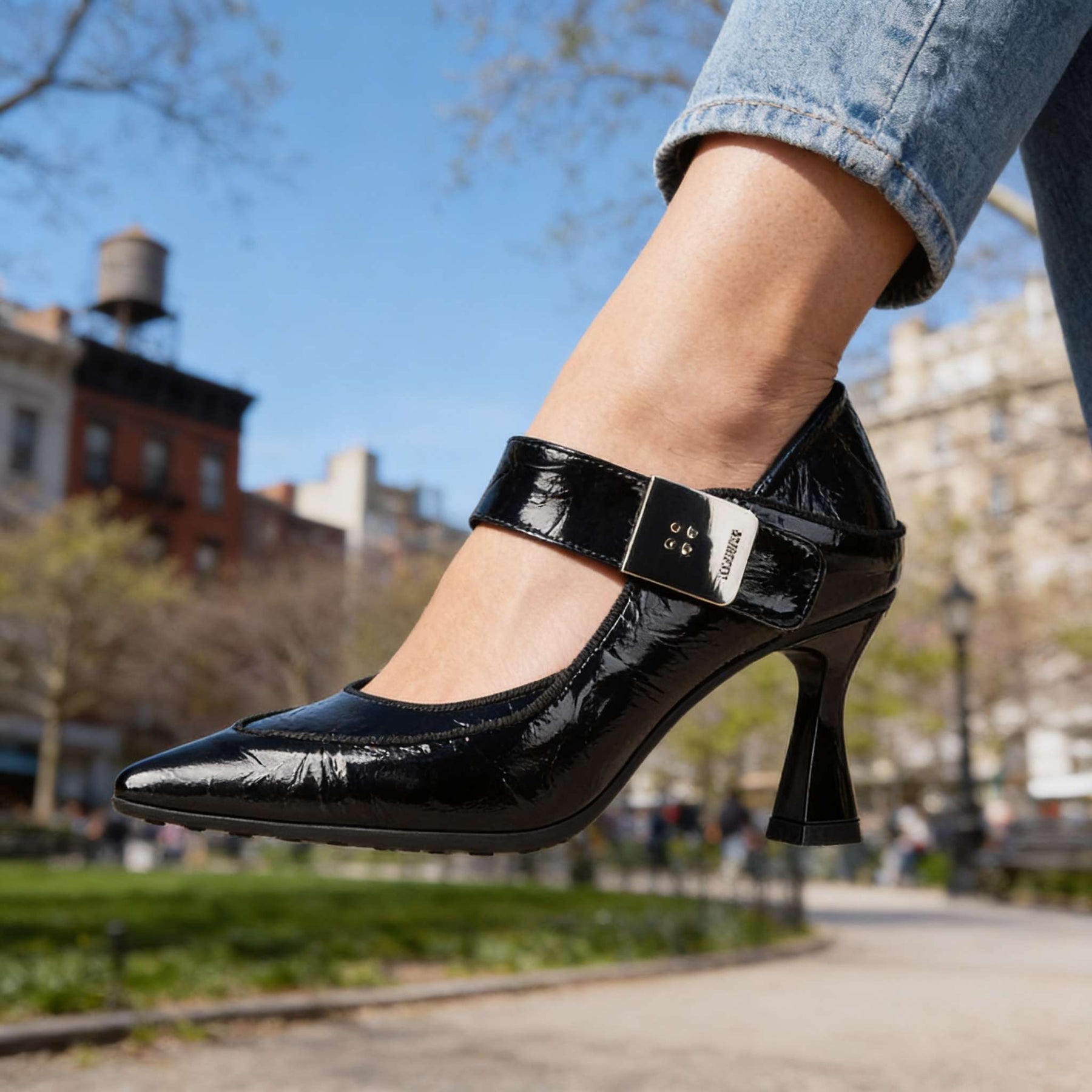 Designed in textured patent with a smooth finish. A cushioned insole supports comfortable wear through extended use. The folded heel allows the shoe to be worn as a slip-on. Finished with an anti-slip sole and a buckle strap for a secure fit, set on a slim yet stable heel.